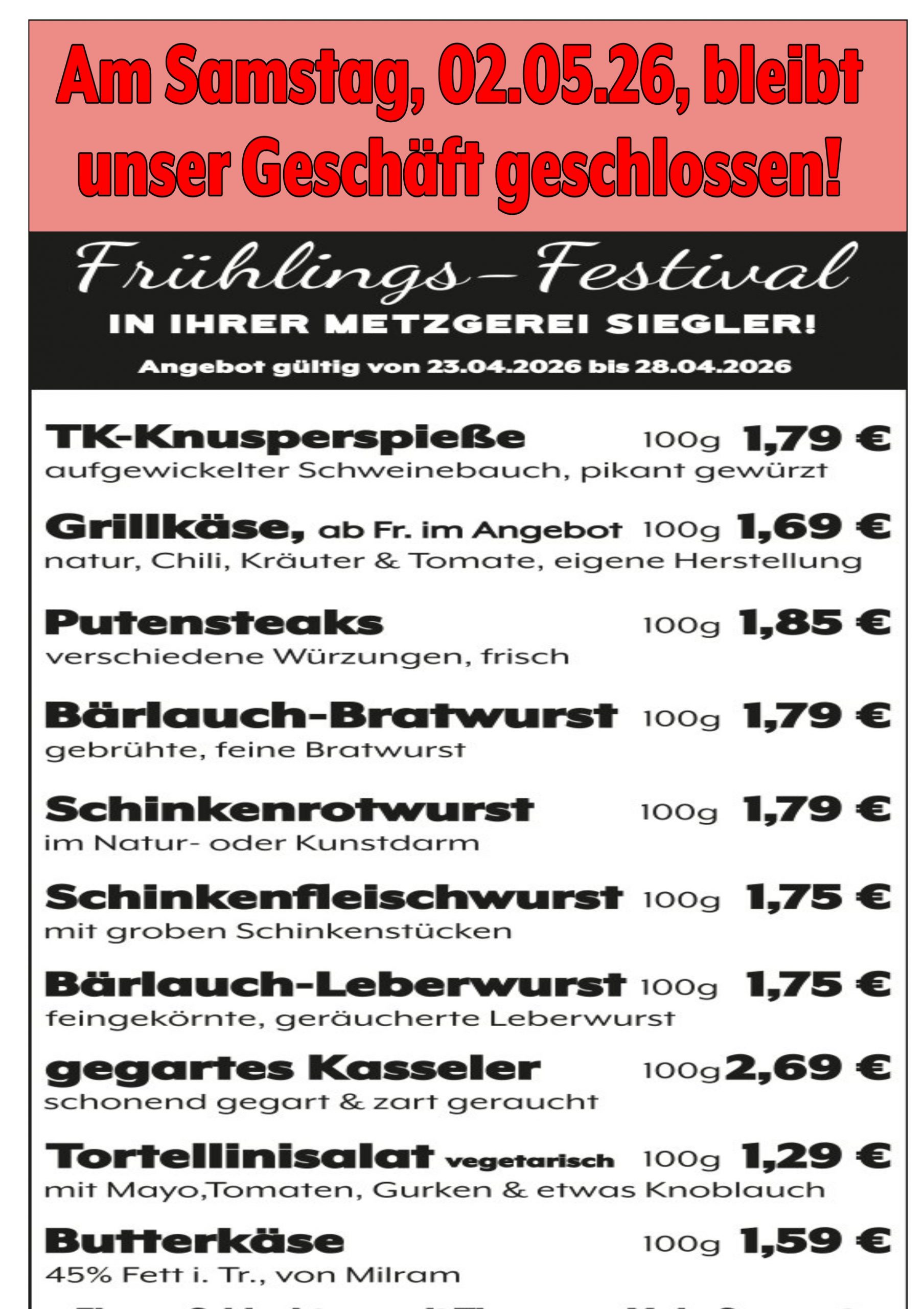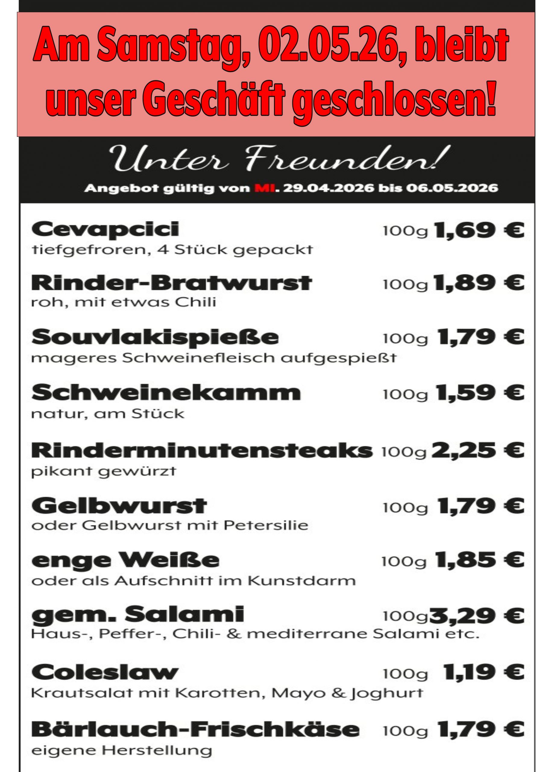 Samstag, 02.05.2026, bleibt unser Geschäft geschlossen!